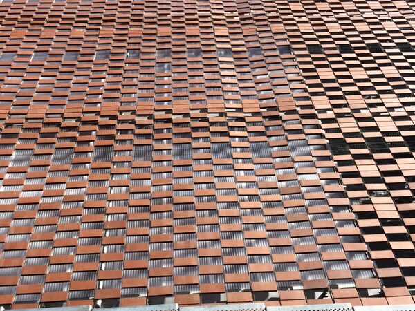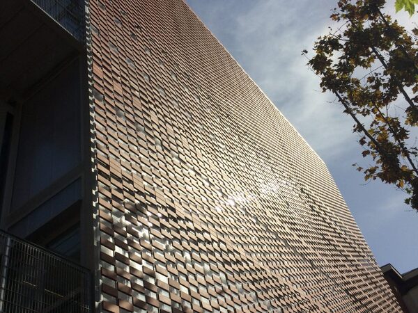 Instalación de fachada con sistema Flex-Brick, con malla de acero inoxidable y piezas cerámicas integradas.