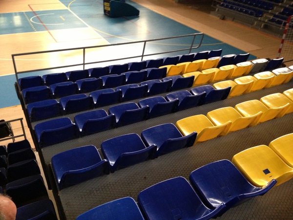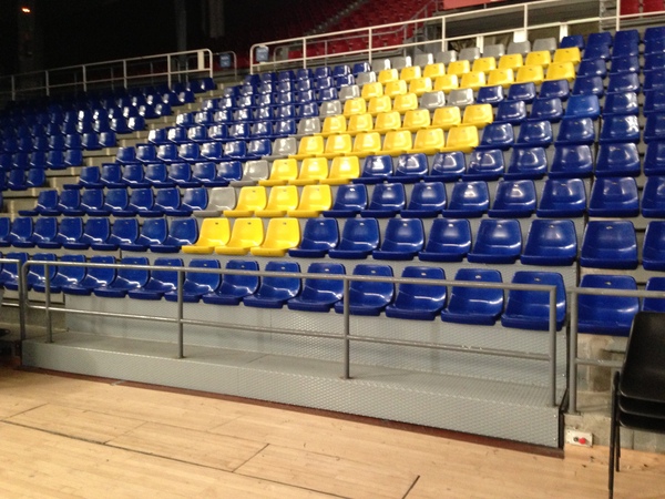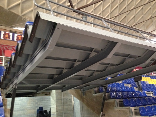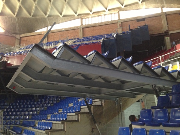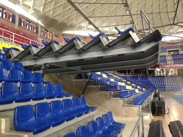 Grada metálica elevable mediante sistema de pistones hidráulicos, incorporando barandillas y asientos.