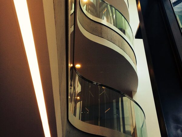 Barandillas de escalera con base de acero fijado a canto de forjado, cristales laminados con curvas y pasamanos y barandillas de acero y acero inoxidable